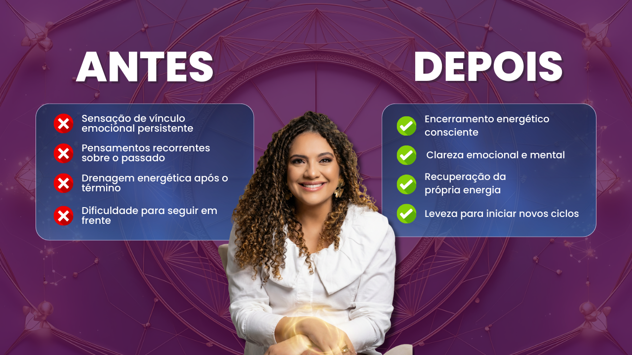 Você entenderá como conexões emocionais e energéticas são formadas nos relacionamentos e por que podem permanecer ativas mesmo após o término. Este módulo estabelece a base teórica e perceptiva para todo o processo de libertação.